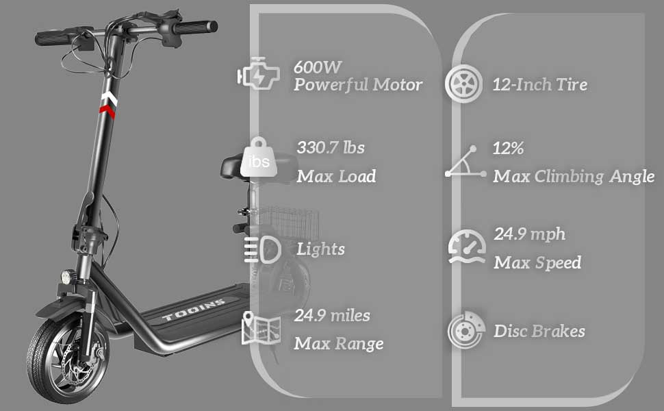 Large 12-inch tires improve stability and traction on various road surfaces, while the height-adjustable seat allows riders to find a comfortable riding position. The scooter handles slopes up to 12% and is suitable for a wide range of urban environments. For best performance, it’s recommended to store the scooter in dry conditions between 10°C and 30°C.