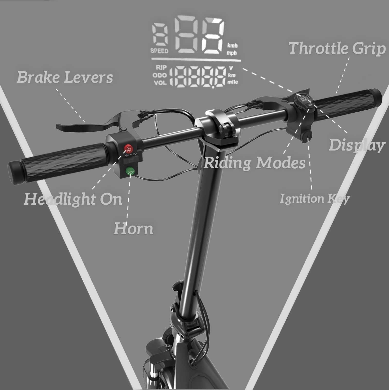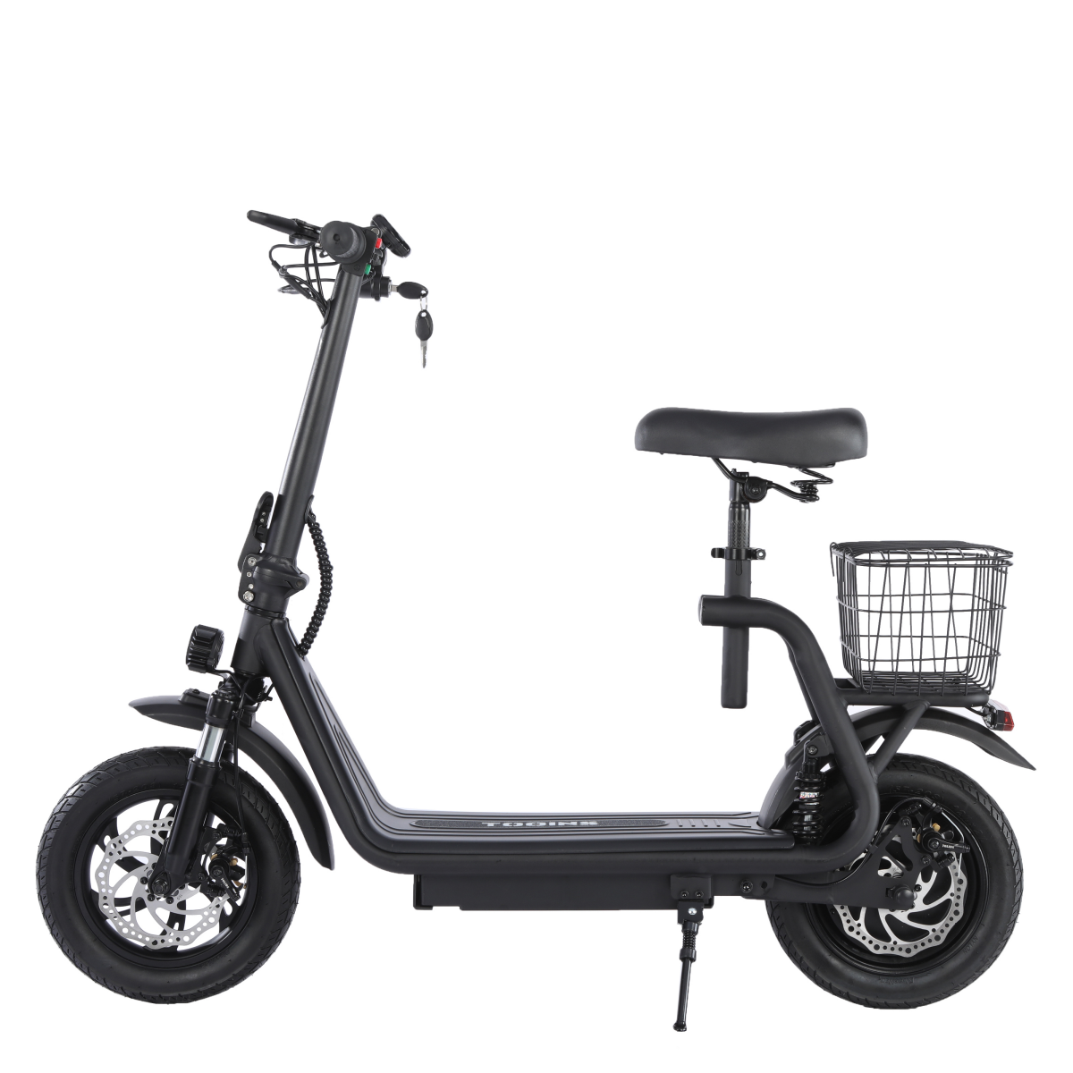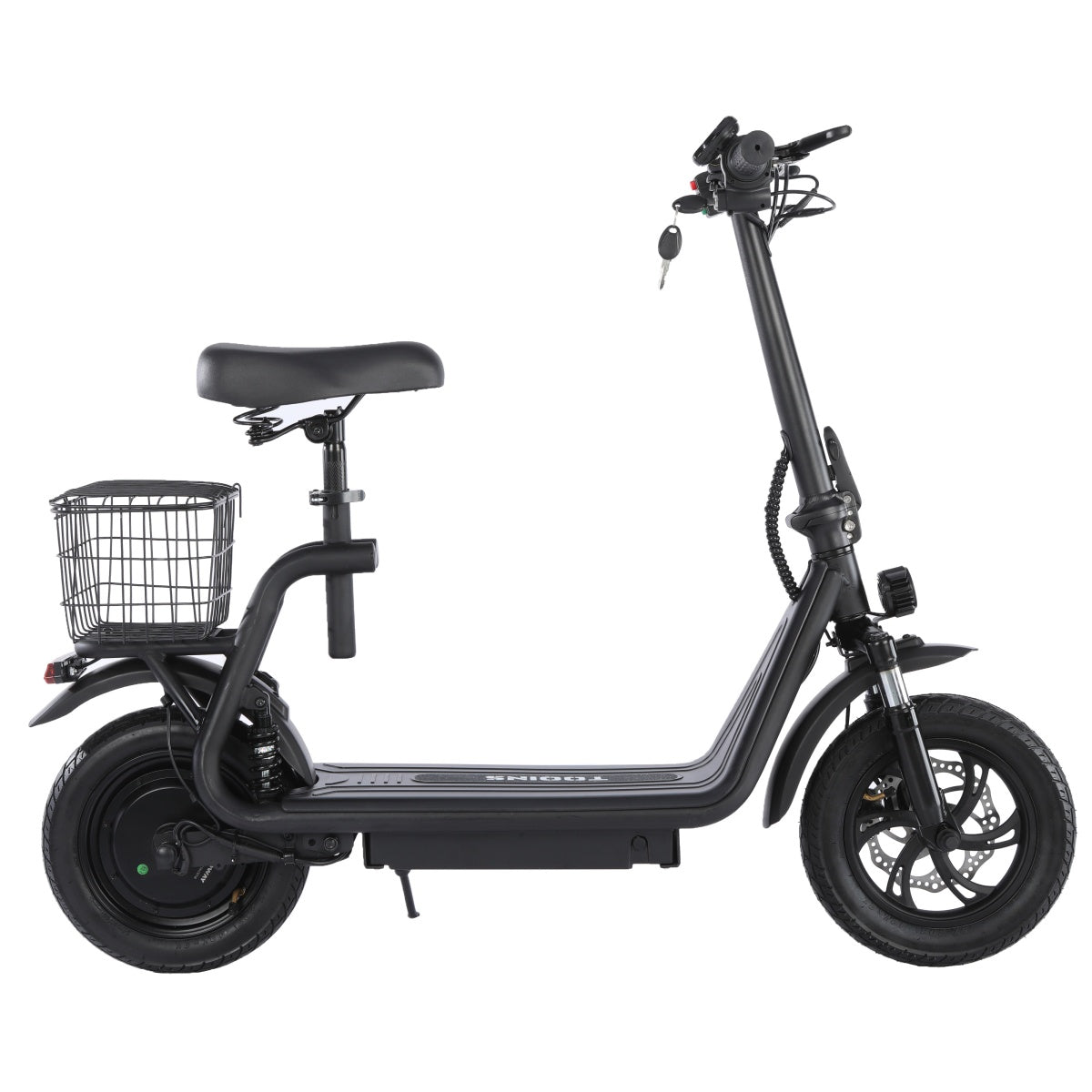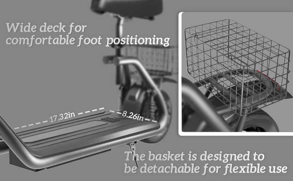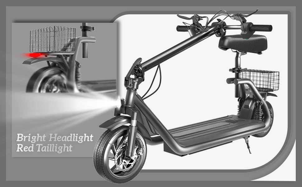 Front and rear disc brakes provide dependable stopping power, and the full lighting system improves visibility in low-light conditions. The removable seat and rear basket add convenience for carrying personal items. An intuitive display offers three riding modes, and the folding design makes the scooter easy to store or transport when not in use.