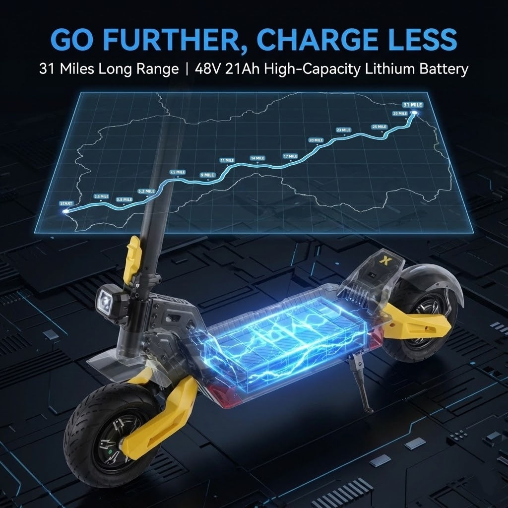 Range anxiety is a thing of the past. Equipped with a massive 48V 21Ah lithium-ion battery, the X2 gives you the freedom to roam up to 31 miles on a single charge. From your morning commute to a weekend escape off the beaten path, our intelligent Battery Management System (BMS) ensures efficient power output and long-lasting reliability.